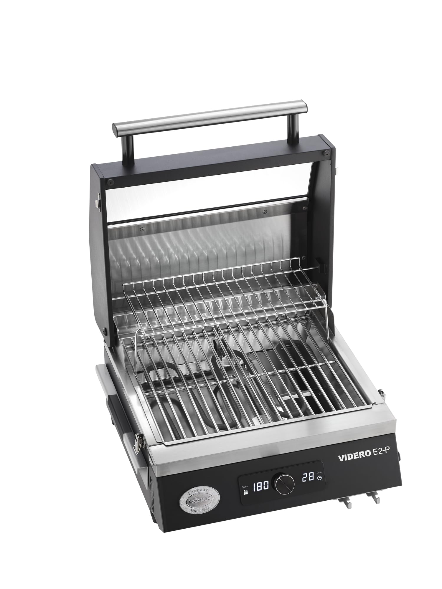 RÖSLE Videro E2-P | Barbacoa Eléctrica Portátil de Mesa, 2 Quemadores, Rejilla Calentamiento, Tapa Cristal, Acero Recubierto, Negro/Plata